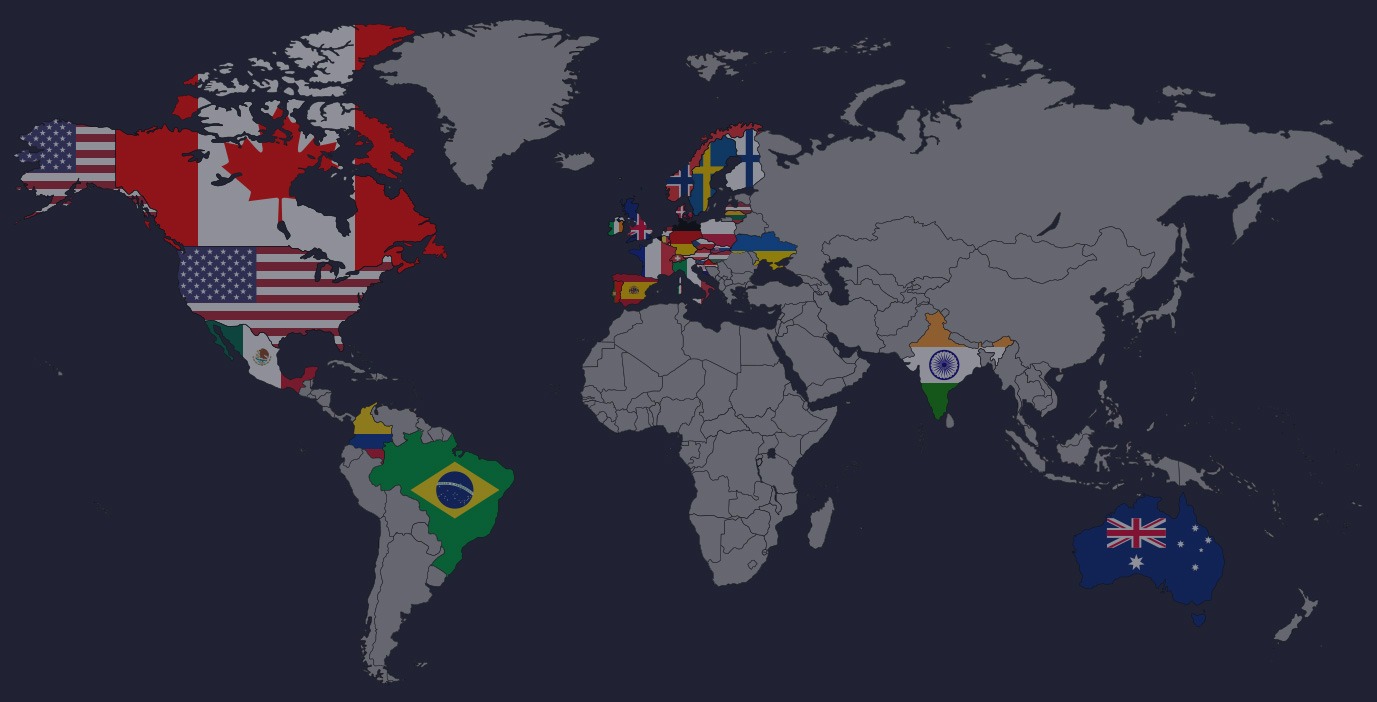 Australia, Austria, Belgium, Brazil, Canada, Colombia, Croatia, Czech Republic, Denmark, England, Finland, France, Germany, Hungary, India, Ireland, Italy, Latvia, Lithuania, Luxembourg, Malta, Mexico, Netherlands, Norway, Poland, Portugal, Romania, Scotland, Slovakia, Slovenia, Spain, Sweden, Switzerland, Ukraine, United States of America, Wales.